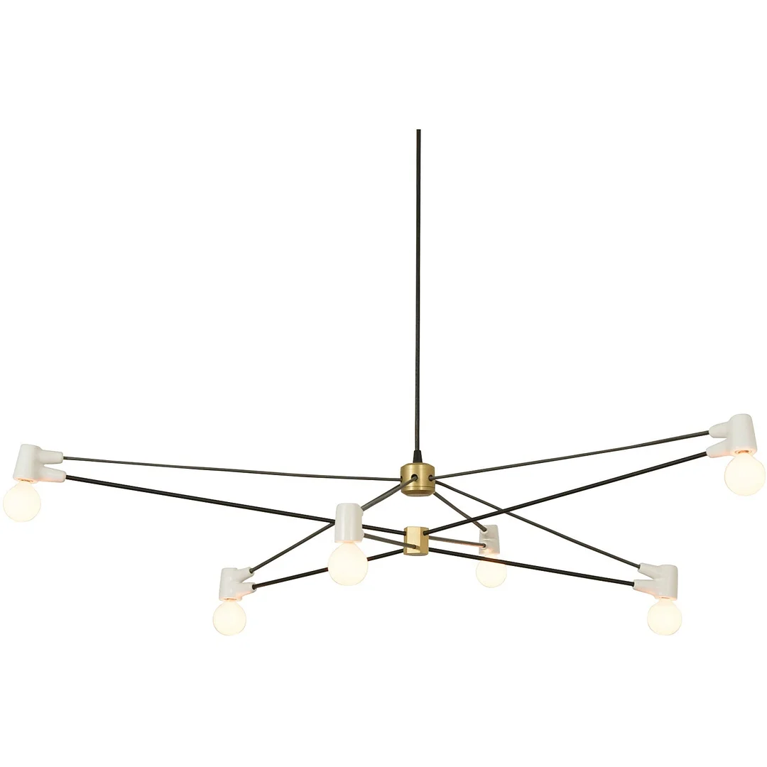 The Cord Chandelier floats dramatically overhead, with a three-part axis of symmetry that provides welcome intrigue to rectilinear rooms. This is a tensegrity structure, where the compression of the steel arms resists the tension of the cloth-covered electrical cords to hold the custom ceramic sockets aloft. Each chandelier is built to order in their Los Angeles studio.